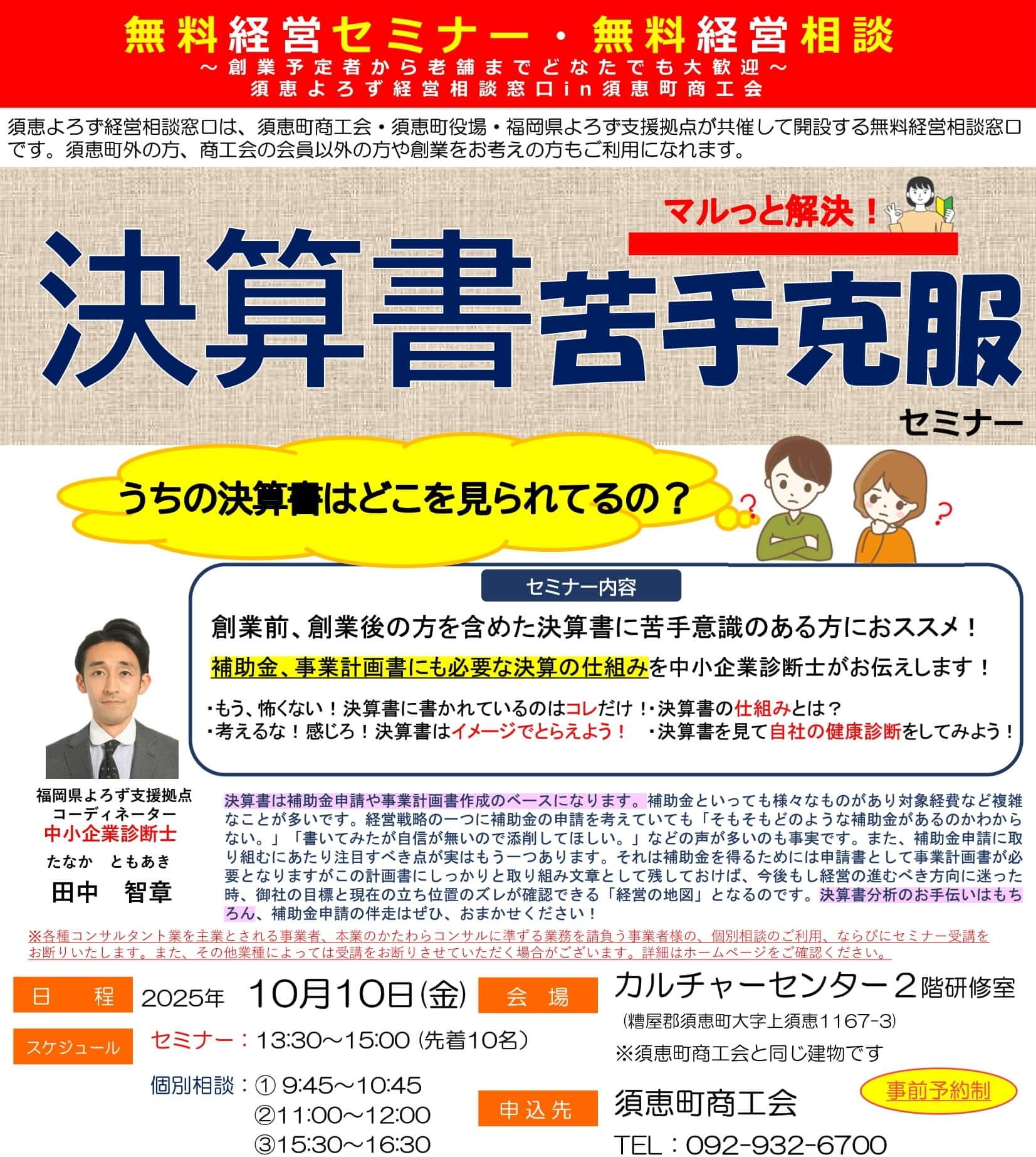 2025年10月10日(金)13:30~15:00(会場:須恵町カルチャーセンター 2階研修室 【申込先】須恵町商工会(TEL:092-932-6700))